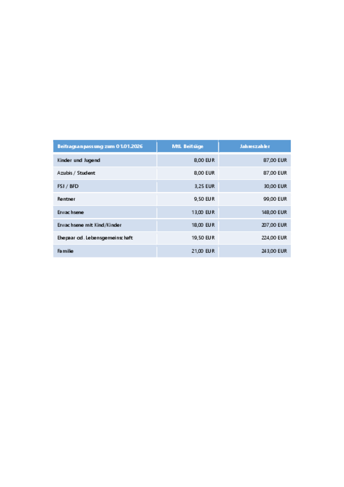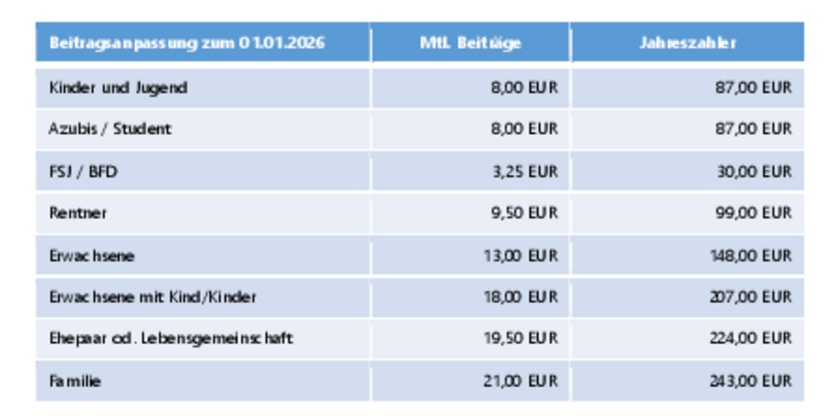 Mit der Anpassung sichern wir die Qualität und Vielfalt unseres Sportangebots für alle Altersgruppen und stellen unseren Verein solide für die Zukunft auf. Die neuen Beitragssätze werden automatisch ab dem 01. Januar 2026 wirksam.