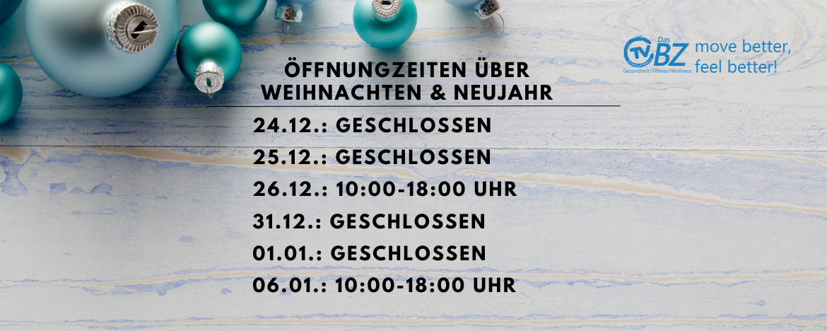 während der bevorstehenden Feiertage ändern sich unsere Öffnungszeiten. Wir möchten sicherstellen, dass alle unsere Mitglieder und Gäste ihre Trainings- und Entspannungspläne entsprechend planen können. Bitte beachten Sie die folgenden Änderungen: